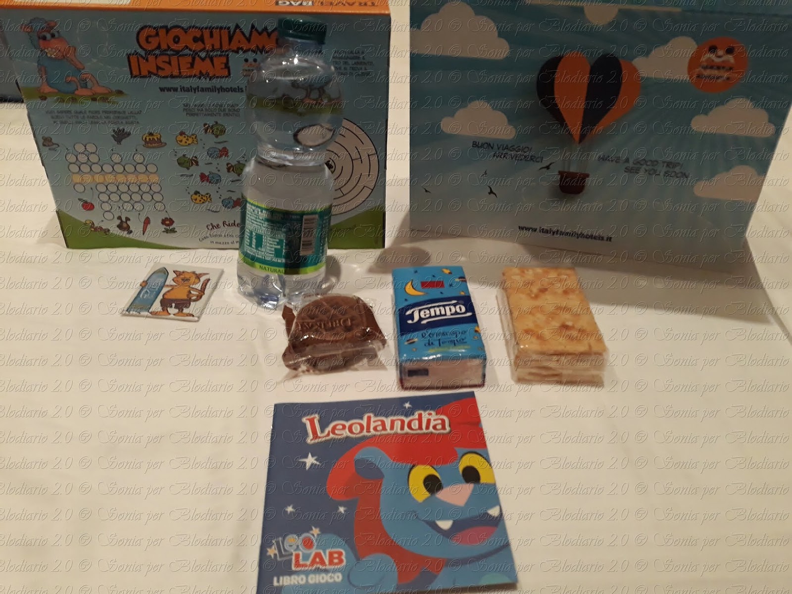 libretto con dei giochi e passatempi, degli snack, una bottiglietta d'acqua ed